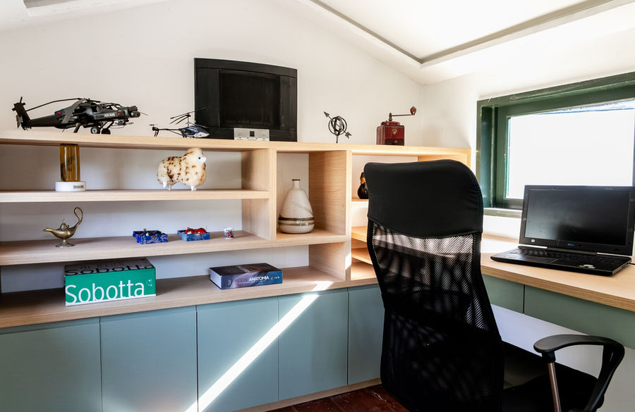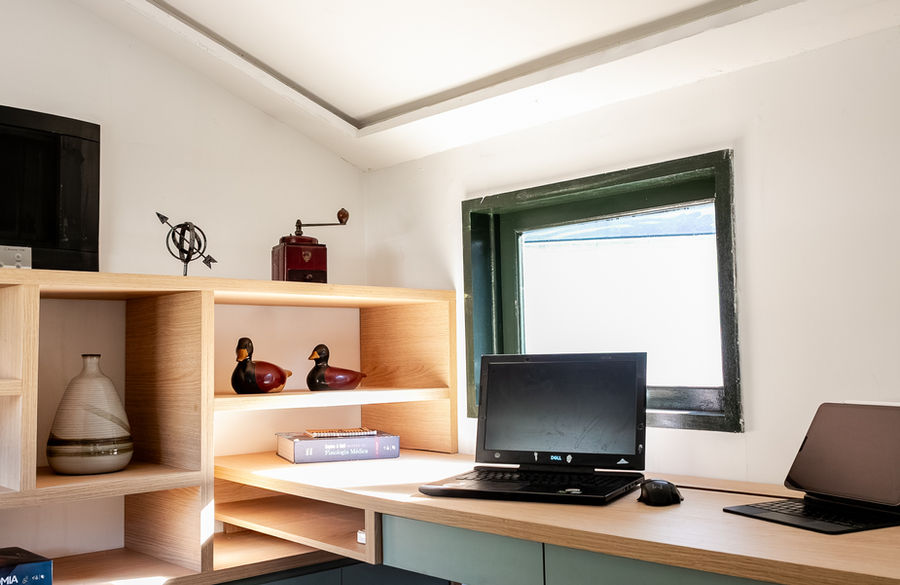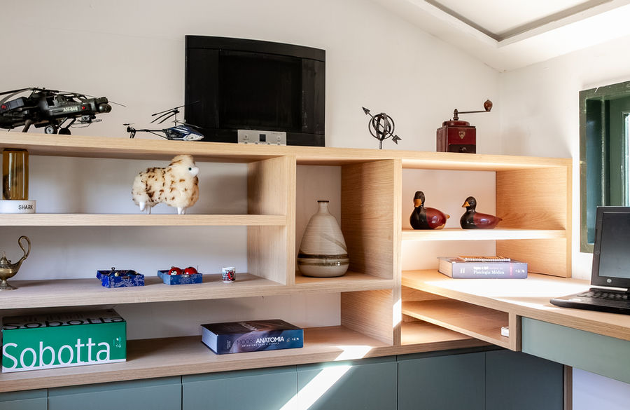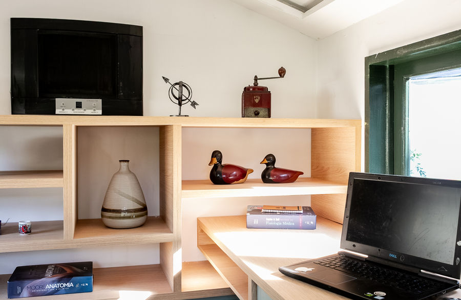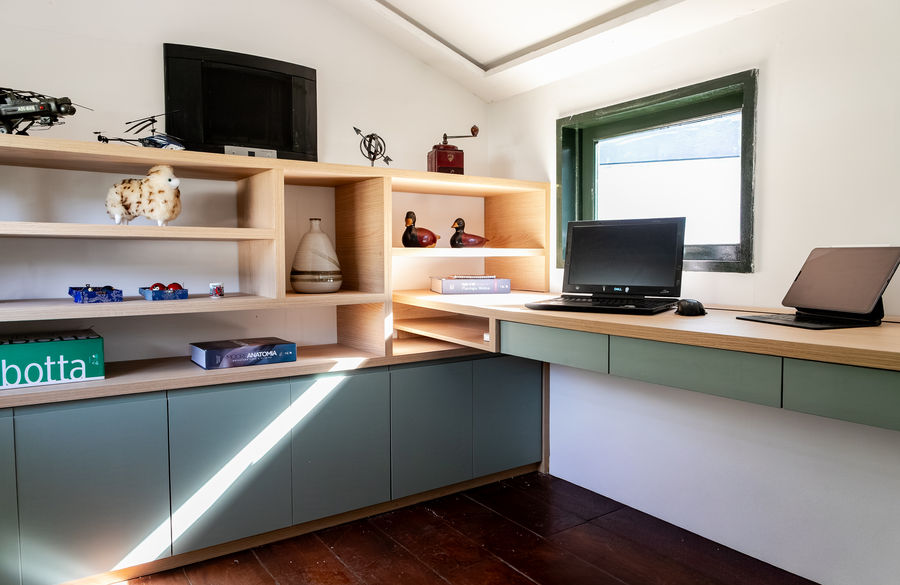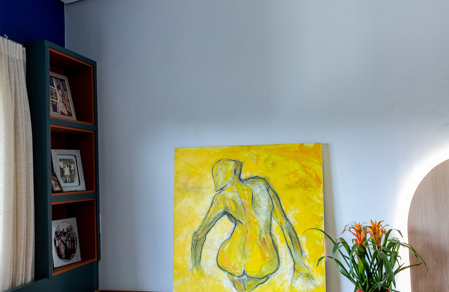 O escritório trouxe um dos maiores desafios do projeto: acomodar cinco pessoas em um espaço reduzido, com duas estações de trabalho duplas e uma mesa administrativa, sem abrir mão de uma estética colorida e eclética. A copa mantém uma linguagem mais neutra e funcional, garantindo unidade visual com as áreas comuns da casa. Nas áreas sociais, o espaço gourmet foi pensado para integrar a marcenaria preta existente a novos elementos de cor, criando um ambiente mais convidativo e vibrante.